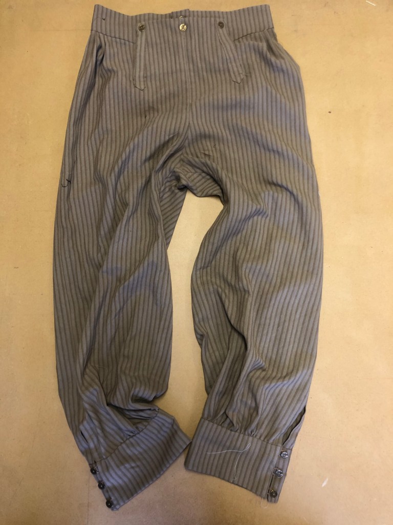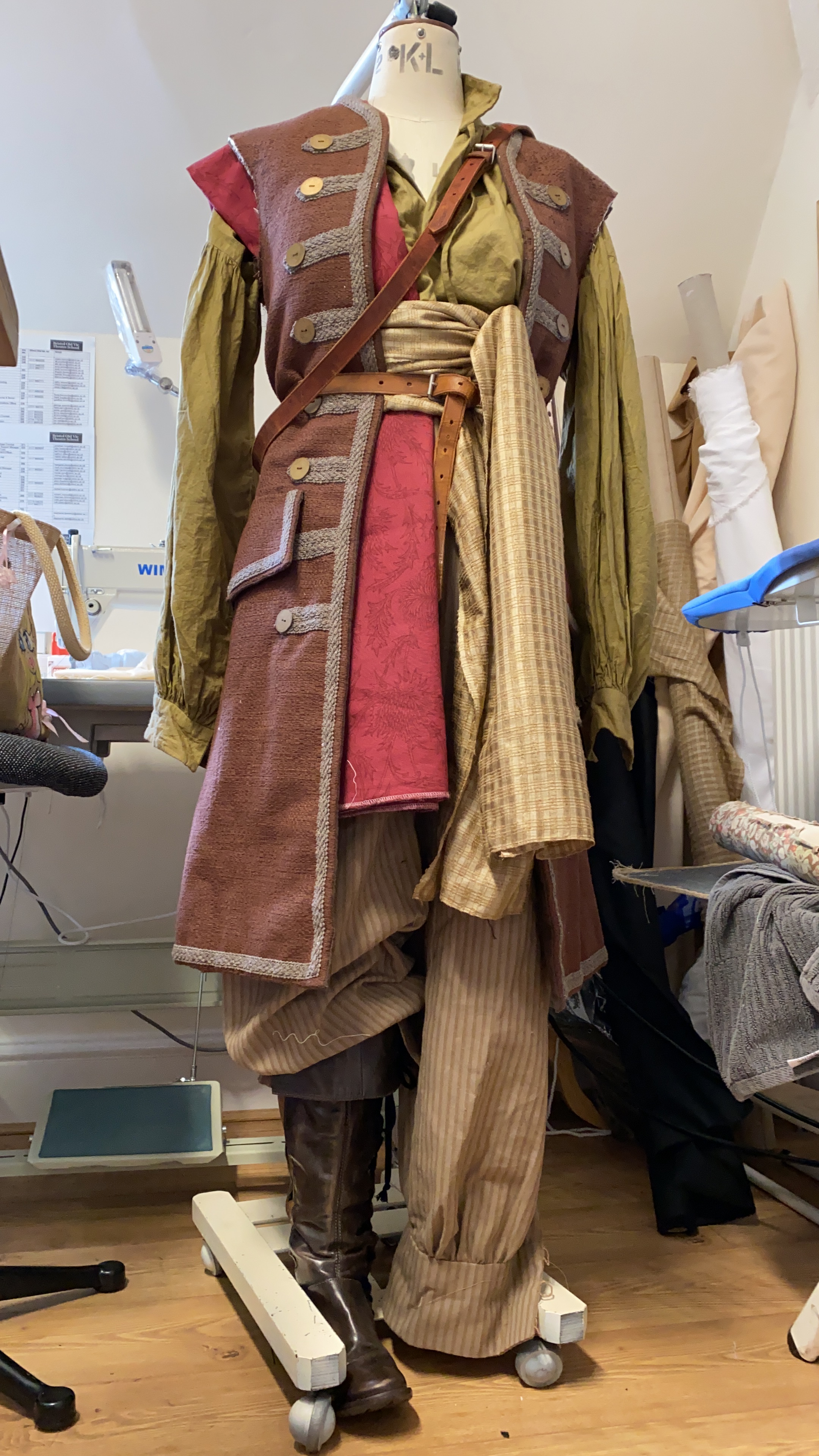 The trousers were made using a men’s pattern and dyed from cream and brown stripes to a rich brown, adding brass buttons for authenticity. While I didn’t add pockets for Anne’s look, I knew they’d be useful for other pirate characters. The trousers were designed to reflect a rough-and-ready pirate lifestyle—practical, simple, and rugged.